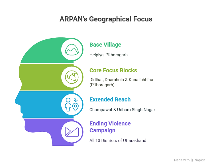 Our core geographic focus is in the blocks of Didihat, Dharchula, and Kanalichhina in Pithoragarh district, while our reach extends to Khirdwari village in Champawat and Chakarpur village in Udham Singh Nagar. Through grassroots engagement, we currently work across 90 villages spanning these three districts. Our Ending Violence against Women and Girls is a regional campaign operating across all 13 districts of Uttarakhand.